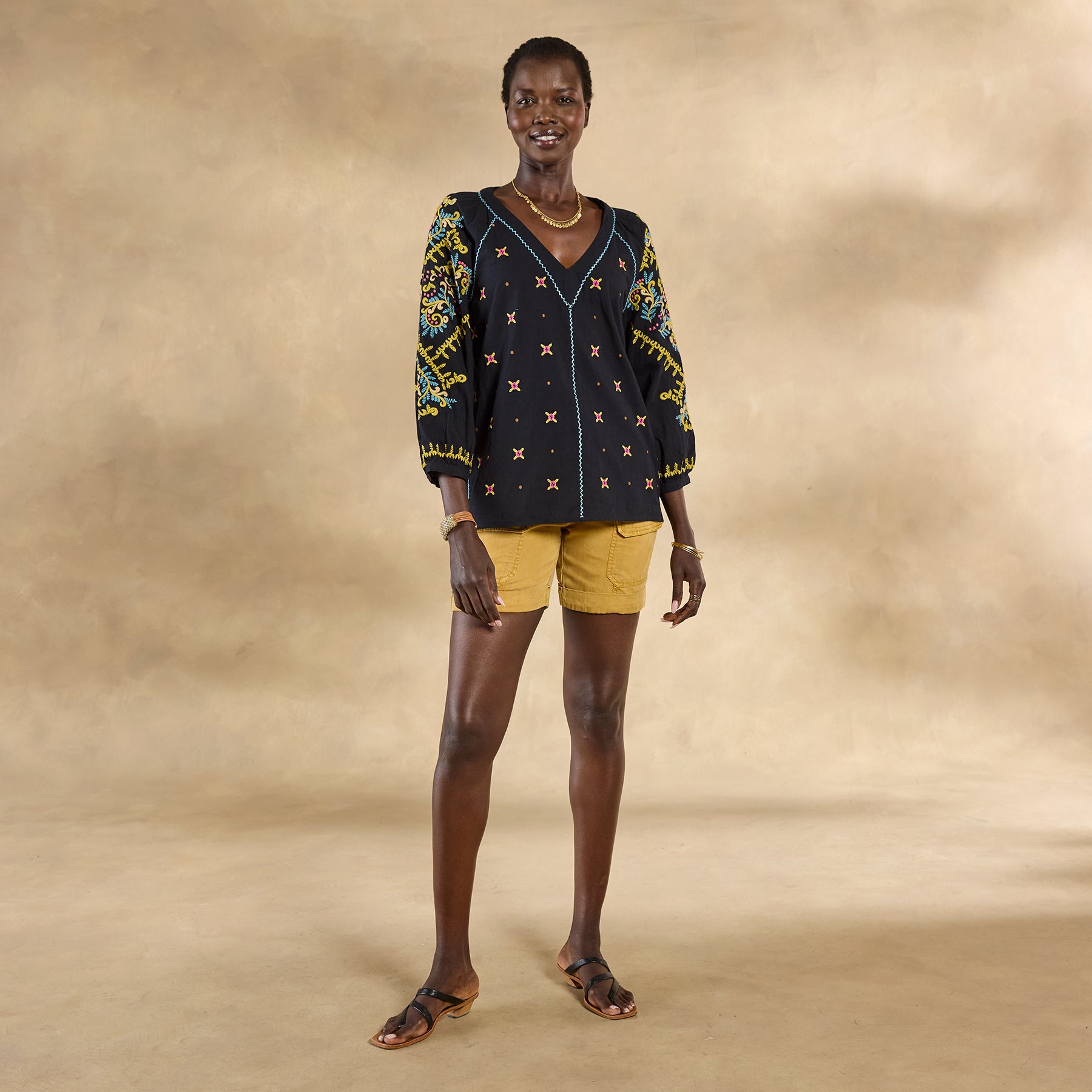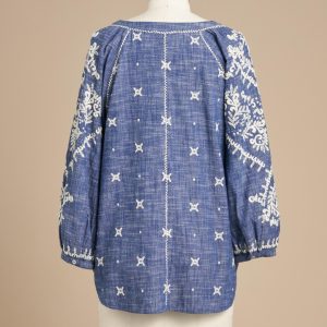There’s joyful bohemian flair in this yarn-dyed top with luscious allover embroidery. blanket stitch details. three-quarter sleeves. shell buttons and V-neck. Full. easy fit. Cotton. Machine wash. Imported. Exclusive. Sizes XXS (00). XS (0 to 2). S (4 to 6). M (8 to 10). L (12 to 14). XL (16 to 18).Approx. 22-1/2L.