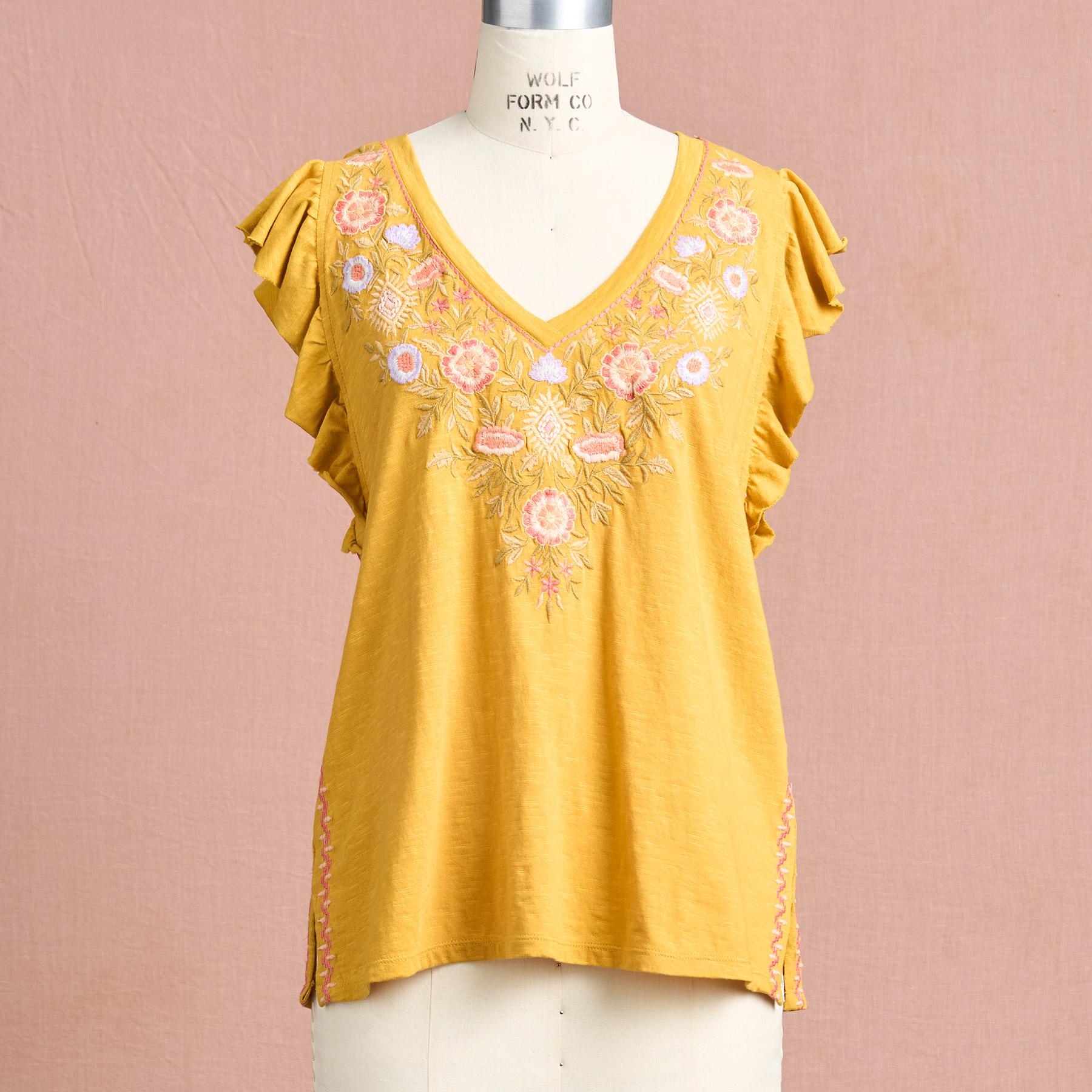 Slip into our easy-fit top with lush. floral embroidered border at V-neck. flowing flounce sleeves with raw-edge ruffle. geometric embroidery at side seams and side slits for comfort. Cotton. Machine wash. Imported. Exclusive. Sizes XXS (00). XS (0-2). S (4-6). M (8-10). L (12-14). XL (16-18). Approx. 23.5l.