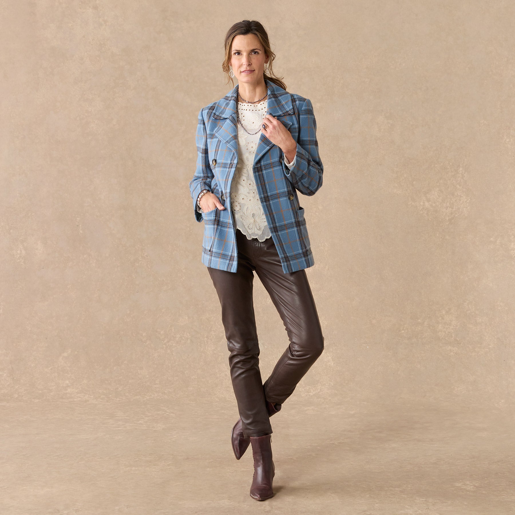 Our smart. brushed flannel plaid pea coat is soft. classic and beautiful. Double breasted. with faux horn buttons. patch pockets and a fun. floral-printed lining. Polyester. Dry clean. Imported. Exclusive. Sizes XS (0?C2). S (4?C6). M (8?C10). L (12?C14). XL (16?C18). XXL (20?C22). Approx. 29l.