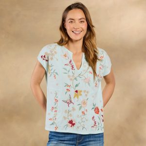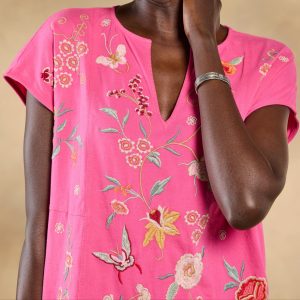 Beautiful floral and geometric embroidery flutters across the front and back of this easy-fit. notch neck top with cap sleeves and side slits. Cotton. Machine wash. Imported. Sizes XXS (2). XS (4). S (6). M (8-10). L (12). XL (14). Approx. 24.25l.