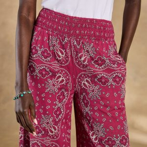 A comfy smocked waist. a wide leg and the airiest cotton with a bright-pink bandana print??there’s SO much to love about our Woodrose Pants. Side-seam pockets. Cotton. Machine wash. Imported. Exclusive. Sizes 2?C16. 29 inseam.